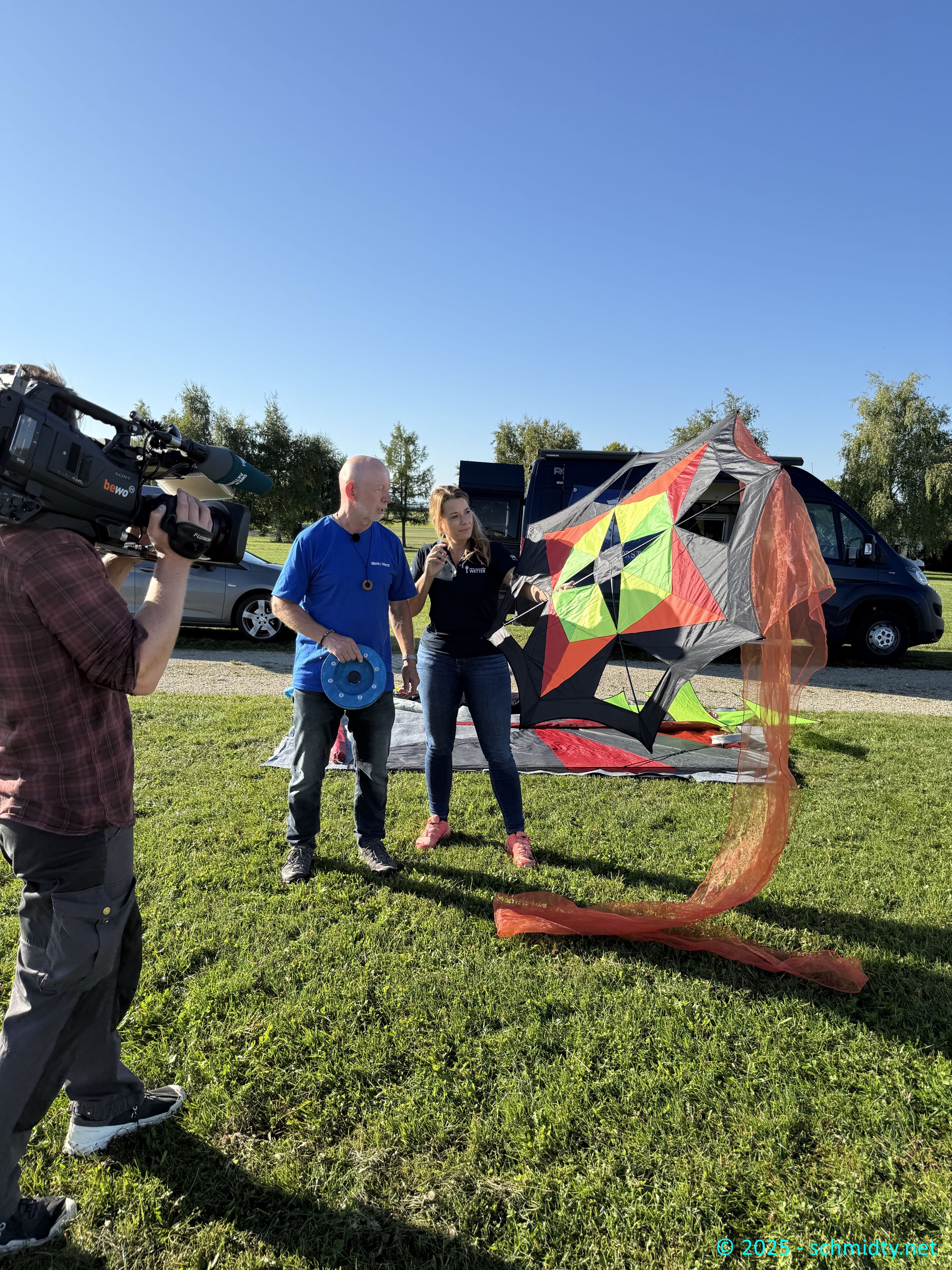 Kurz vor dem Drachenfest Leibertingen hat sich das SWR 3 Fernsehen bei uns gemeldet und wollte einen Beitrag für SWR Wetter mit uns drehen. Wir haben dazu noch drei Mitglieder unserer Gruppe Chat-Kiter zum Drehtag am Freitagmorgen eingeladen. Der Beitrag wurde am selben Tag (19.09.2025) abends bei SWR Wetter gesendet (siehe Link am Ende des Textes).